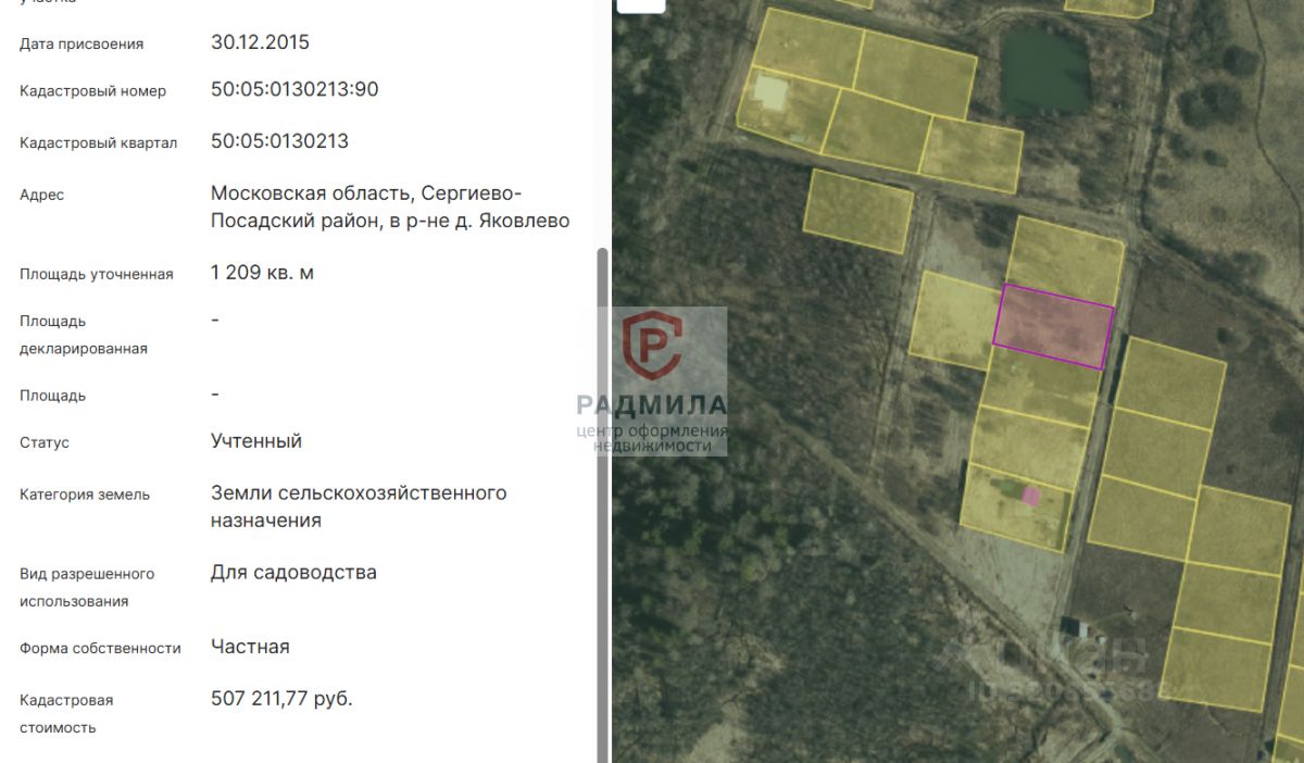 Земельный участок 1209 кв.м, отмежеван. Ровный и сухой. В собственности на основании Постановления более 5 лет. Кадастровый номер 50:05:0130213:90. Колышки выставлены.